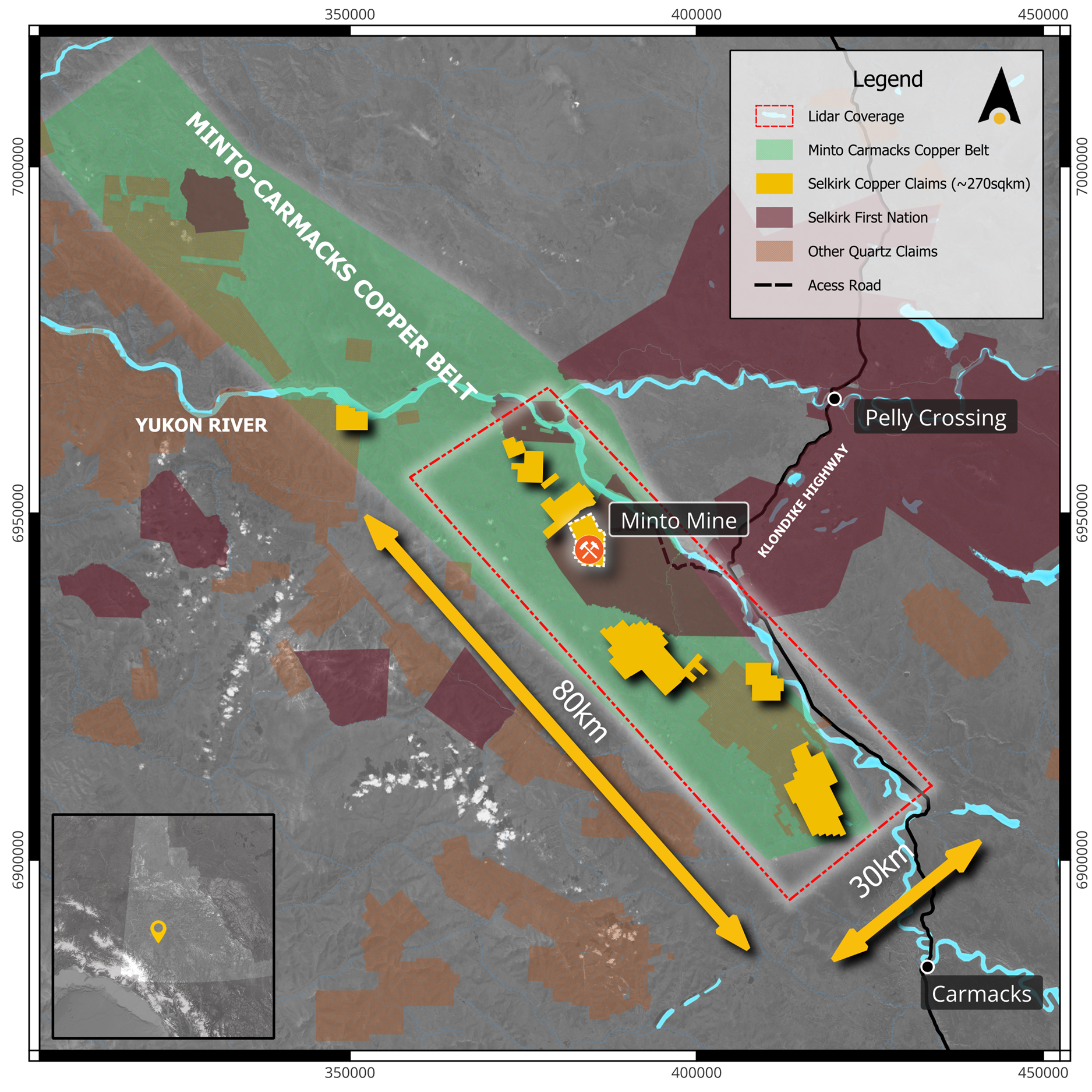 Figure 4: Regional map of the Minto-Carmacks Copper Belt, showing the extent of the 2025 LiDAR survey (red rectangle).