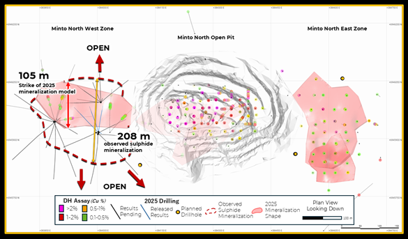 Drilling from the current program has returned grade and thicknesses comparable to historical 2021 and 2022 intersections, confirming continuity of the Minto North system. Higher-grade intervals correlate with increased visual sulphide abundance, particularly well-developed foliaform textures and localized zones of semi-massive and net-textured sulphides, often accompanied by a higher bornite-to-chalcopyrite ratio. Bornite has been visually logged in several step-out holes, indicating the system remains open along strike. Drilling to date has successfully identified chalcopyrite and bornite extending over 208 m in strike length, nearly doubling the 105-metre extent defined in the 2025 mineral resource estimate (MRE) model (Figure 1). For more information on 2025 MRE see Table 4.