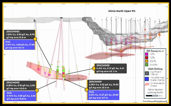 December 1, 2025 – Vancouver, BC and Pelly Crossing, YT – Selkirk Copper Mines Inc. (TSX-V: SCMI)(FRA:IO20) (“Selkirk Copper” or the “Company”) is pleased to announce assay results from the first four drill holes of the 50,000 m program, which strategically test the size and continuity of the high grade Minto North West Zone with highlights from drill hole 25SCM001 of 2.39% Cu, 0.32 g/t Au and 11.61 g/t Ag over 23.4 meters, including a higher grade core of 5.21% Cu, 0.47 g/t Au and 26.68 g/t Ag over 8.7 meters, and from drill hole 25SCM002 of 1.53% Cu, 0.93 g/t Au and 6.76 g/t Ag over 31.6 meters from hole 25SCM002, including a higher grade core of 3.73% Cu, 2.56g/t Au and 17.90g/t Ag over 9.5 meters.