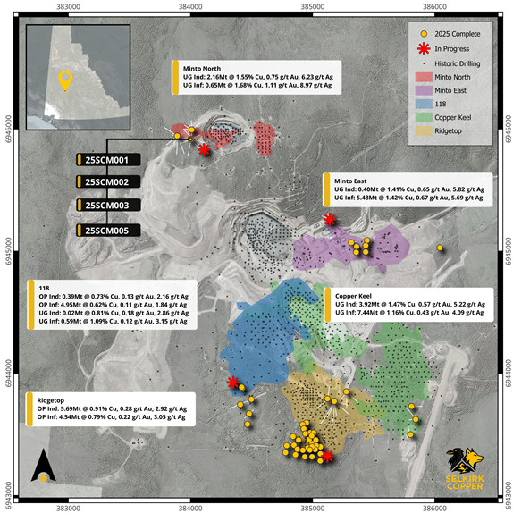 Figure 3: Plan view of the Minto Mine showing surface projections of mineralization zones (Ridgetop, Copper Keel, 118, Minto East and Minto North), relative to 2025 drill collars (yellow circles). Update 2025 Mineral Resources by zone are provided. See table 4 at end of release for full Mineral Resources details.